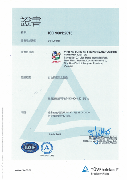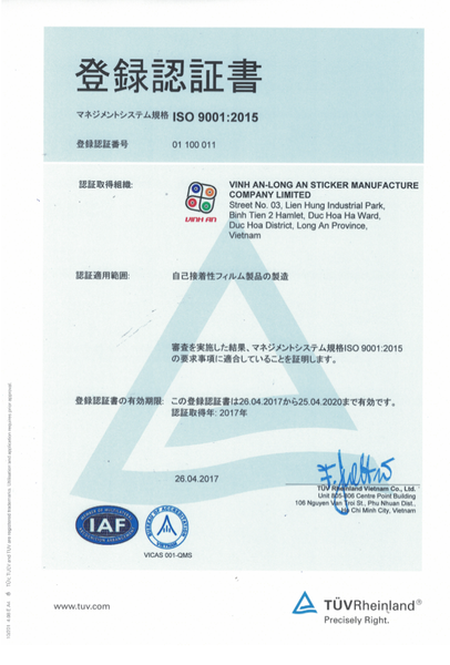 Công ty TNHH SX Decal Vĩnh An – Long An tự hào là doanh nghiệp Việt Nam đạt chứng nhận quốc tế ISO 9001:2015 do TÜV Rheinland (CHLB Đức) – tổ chức chứng nhận uy tín hàng đầu thế giới – cấp phép.